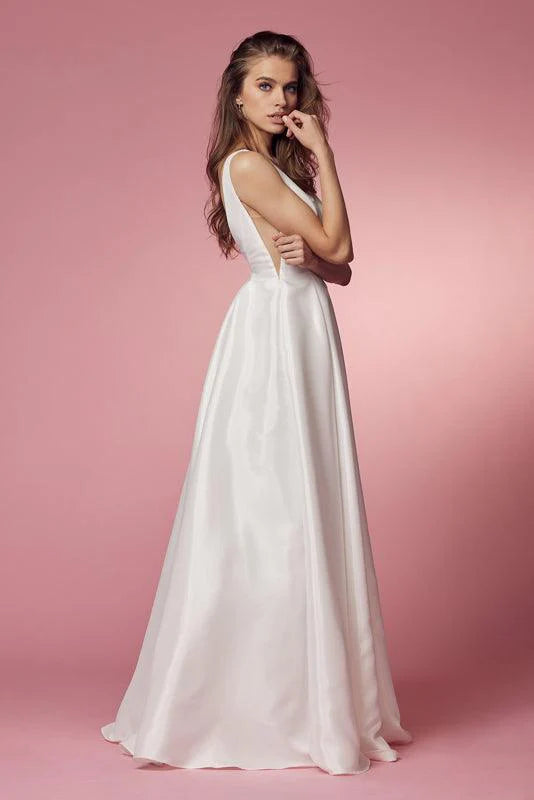 Look divine in this sleeveless taffeta wedding dress, a true dream come true. With a plunging V-neckline and open V-back design, exude elegance. The long box pleated A-line skirt with pockets is perfect for any special event. Made from high-quality materials, you'll feel comfortable and beautiful all day. Sizes 2-20, in classic white.